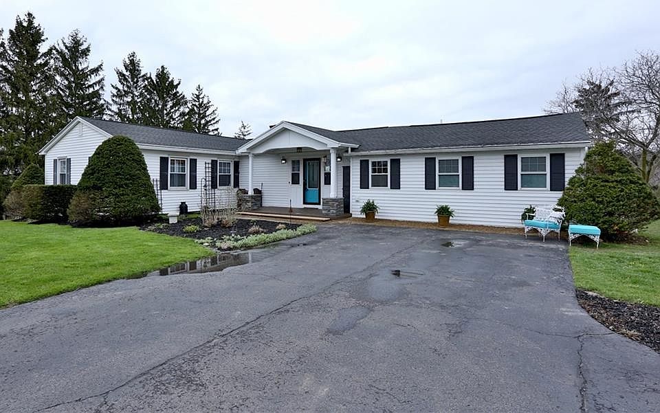 SEE ATTACHMENTS for MAP of HOUSE LOT & adjoining piece of land (sold separately). Sprawling ranch sits back from rd on deep lot! Open kitchen w/energystar stainless appliances, fireplac & sliders to huge deck overlooking treed lot. Good-sized rooms inclu. updated master suite that's bright & airy w/updated bath. Darling office nook conveniently located off kitchen helps keep you organized. Lrg fam rm w/sliders to deck. Tons of potential in walkout basement w/half bath. A country feel that's conveniently located to everything and with Victor schools! Laundry rm currently in basement but plumbing for 1st floor too! Shed in back w/concrete floor & great storage! A must see!