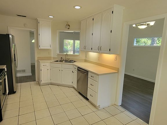 Beautiful ranch home in Flowery Branch lake community just steps from Lake Lanier. This 3 BR/2BA home has a large 2-car garage w/work sink and plenty of storage. The vaulted family room has a stacked stone fireplace with view to dining room and kitchen. The kitchen has stove/oven, microwave, refrigerator and dishwasher with eat-in breakfast area and pantry. The screened porch views the private, fenced-in backyard. The spacious master suite has a large garden tub and separate shower and a nice large walk-in closet. There are 2 secondary bedrooms with hall bath and laundry closet. Bring your boat and/or jet ski and enjoy the lake life. Easy access to I-985, shopping and restaurants. $2800/month with $2,000 security deposit. Renter is responsible for all utilities including the power, water, garbage pickup and internet.