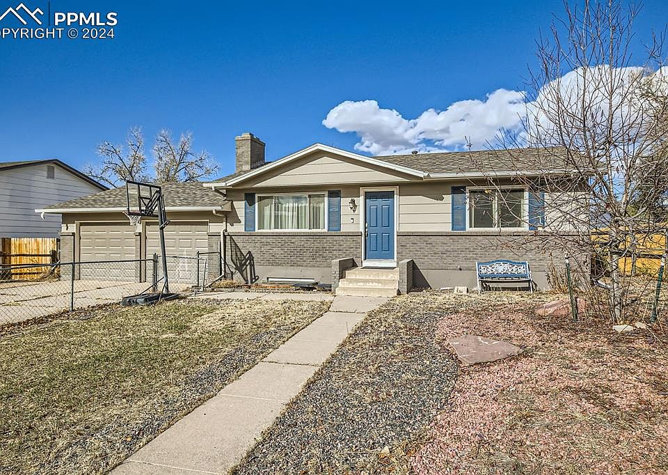 MOVE-IN READY! This 5-bedroom, 2 bath, ranch-style home offers 1,688 sq. ft. of living space, with a spacious 2-car garage, large basement, and cozy fireplaces both upstairs and down, this property provides plenty of room for family and entertaining. The main level features a welcoming living room with a brick fireplace. The kitchen is conveniently located next to the living room, offering a functional layout. The master bedroom is well-sized, with a full bathroom and second bedroom completing the upstairs living space. Downstairs, the basement provides versatile living space with 3 additional bedrooms; ideal for guests, home offices, or hobby rooms. A 3/4 bathroom is also located downstairs, along with a large family room featuring its own brick fireplace, as well as the laundry room. The large fenced yards and covered patio provide the perfect space for outdoor activities, entertaining, and relaxation. Conveniently located near schools, a golf course, and shopping. This home offers easy access to Peterson Air Force Base and a wide range of amenities.