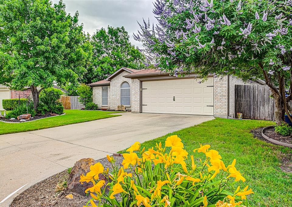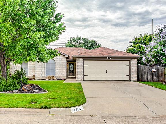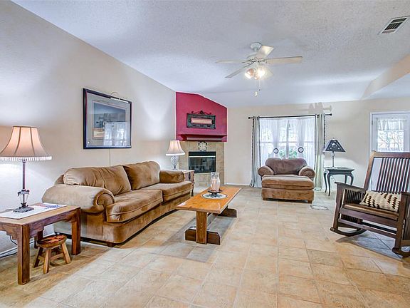 Located in a cul-de-sac, this home stands out for its lovely landscaping. Upon entering, the expansive living area w corner fireplace welcomes you w its open concept dining & kitchen. The kitchen features a granite topped island, gas stove & refrigerator which remains w the home. The 2 secondary bedrooms face the front of the home followed by a full hall bathroom & hall linen closet. At the end of the hall, find the generously sized master bedroom w adjoining spacious master bathroom & walk-in closet. Just beyond the kitchen is a separate utility room w cabinets, room for a refrigerator & more storage if needed. From the living area, step out to an expanded covered patio, shaded backyard & grassy side yard.