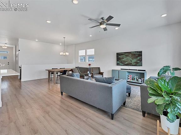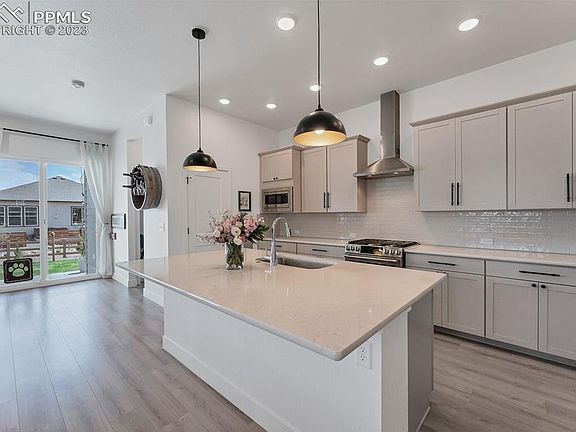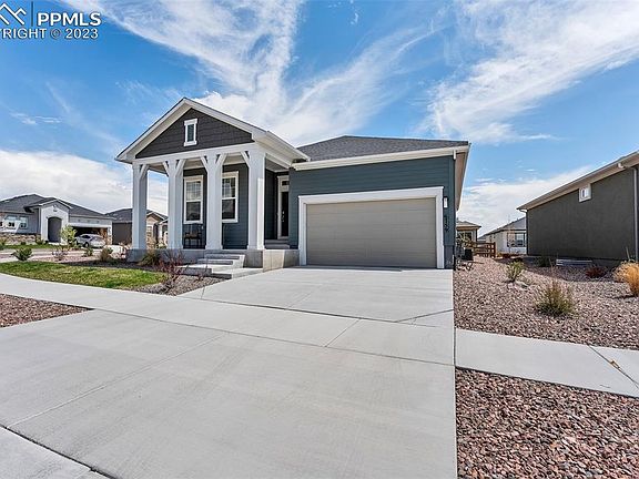 This David Weekly ranch home built in 2021 is located in the well desired Wolf Ranch community on a large corner lot with beautiful views of the mountains and Pikes Peak! The main level features a living room, dining room and gorgeous kitchen with a gas stove, all stainless-steel appliances, oversized island, tons of storage and enjoy the natural light from all of the windows make it feel so warm and cozy. The living room walks out to the patio where you can enjoy those gorgeous mountain views and plenty of room for some outdoor entertaining! The large master suite offers a soaking tub to relax after a long day, a large walk-in closet, and double vanities! The basement family room is so big it has endless options and is perfect for kids to play, gaming area, entertainment area (theater)or both! There is a second master suite with a full bath perfect for guests, or in-law suite. This home is located close to parks, schools, walking trails, shopping and restaurants. Come see your new home today!
