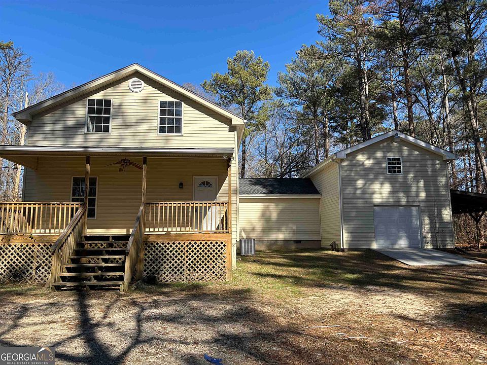 This home is recently updated with fresh paint and flooring. The home has a little of something for everyone. There is a bonus room with half bath off the garage (this space does not have heat/air so it is not included in the heated space). There is a bedroom and half bath on the main level. Upstairs is a full bath, a larger bedroom for the master. One of the additional bedrooms was divided into 2 rooms, both have a closet - but this could be converted to a single bedroom. There is a deck, a 1 car-attached garage, and a detached workshop building. The acreage gives you a place to play, and have privacy and you could fence it in to have animals.