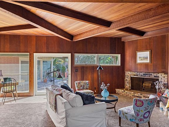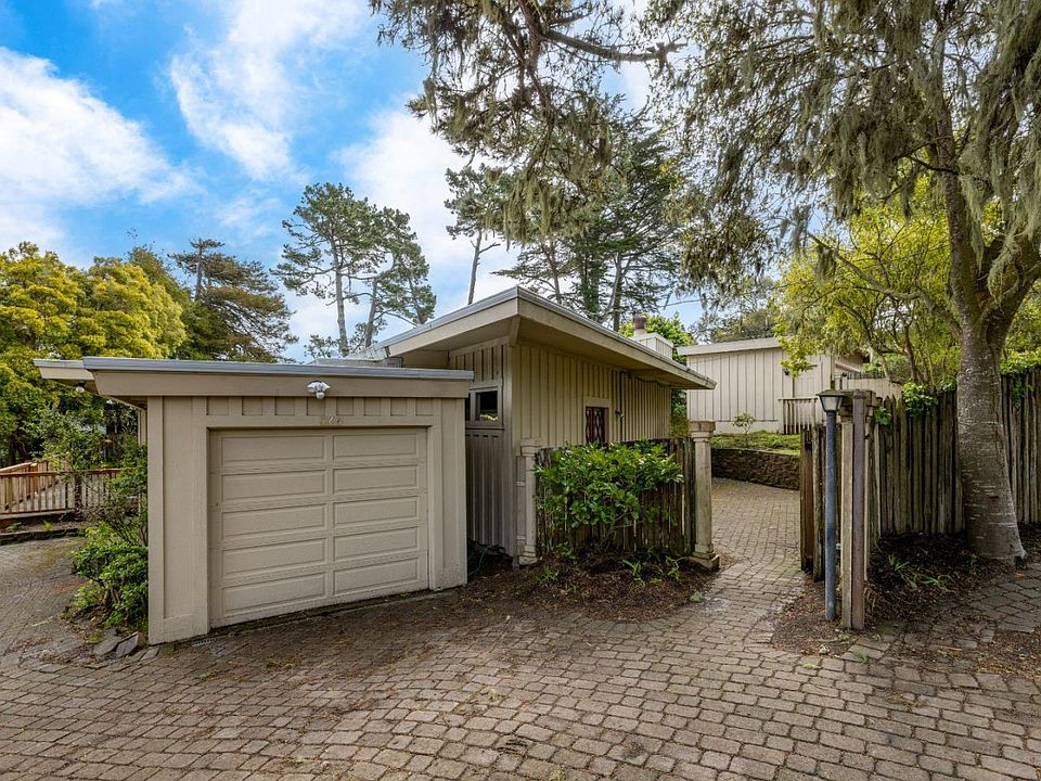 You will love this spacious New Monterey home, with its peaks of the bay, and extra large lot. Frank Lloyd Wright fans will appreciate the nod to his architecture, with this home's sharp angles, high open beam ceilings, four fireplaces and a family room paneled with beautiful old-growth redwood. Cooking will be a dream in the updated kitchen with new cabinets, quartz countertops and a farm sink. The homes divided floorplan is perfect for someone looking for separate living spaces. Outside, enjoy the serenity of the private courtyard with mature landscaping, the backyard, that could be a dog run and a side yard with a lovely patio and peaks of the bay; perfect for barbecuing. Car lovers or hobbyists will enjoy the 2 separate garages; an attached single car garage and a detached 2-car garage. All located near Trader Joes, Safeway, the world famous Cannery Row with its many restaurants and infamous Monterey Bay Aquarium. Come for a visit and stay for a lifetime.
