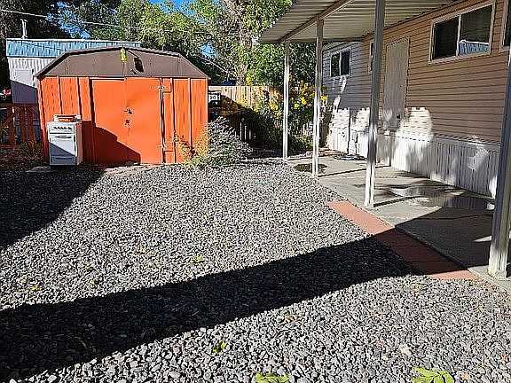 RELISTED - This move-in ready comfy 2 bedroom, 1 large bathroom mobile home has many upgrades and only ¼ mile walk to downtown Delta, shopping, and the Bill Heddles Recreation Center and Parks. Upgrades done in the last 5 years include: All new vinyl windows, large walk-in shower with seat and railing and tile flooring in the bathroom leading into the large master bedroom with newly installed closet. Laminate engineered flooring through entire home, new furnace installed in 2018 and new motor installed in the window swamp cooler in 2023. A separate on demand hot water heater is built in under the kitchen counter for kitchen sink. Washer and dryer are included in 2nd bedroom, as well as stove and refrigerator. There is both gas and electric to the home and home is well-insulated. The roof has been resealed and seamless gutters with leaf-guard installed in 2022. Low maintenance yard with stone landscaping. Carport along with large shed for extra storage needs. This is a gem of a home for downsizing with an open floor plan. Please contact for a BY APPOINTMENT viewing. This is a for sale by owner home. Cash or Personal Property Loan buyer only. Home does not include property, and is tethered on a lot in a MH park with affordable monthly rent that includes water, sewer, and trash. Move in ready for new owners.