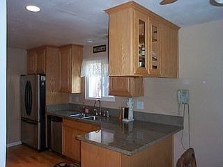 featuring Oak cabinets, granite counters, stainless steel sink, Jenn-Air gas stove top and over, diswasher & micro-wave. Oak flooring in kitchen, dining area, living room and hall. Family room is 16 ft by 14 ft with brick fireplace.