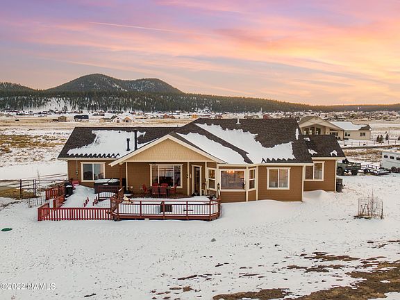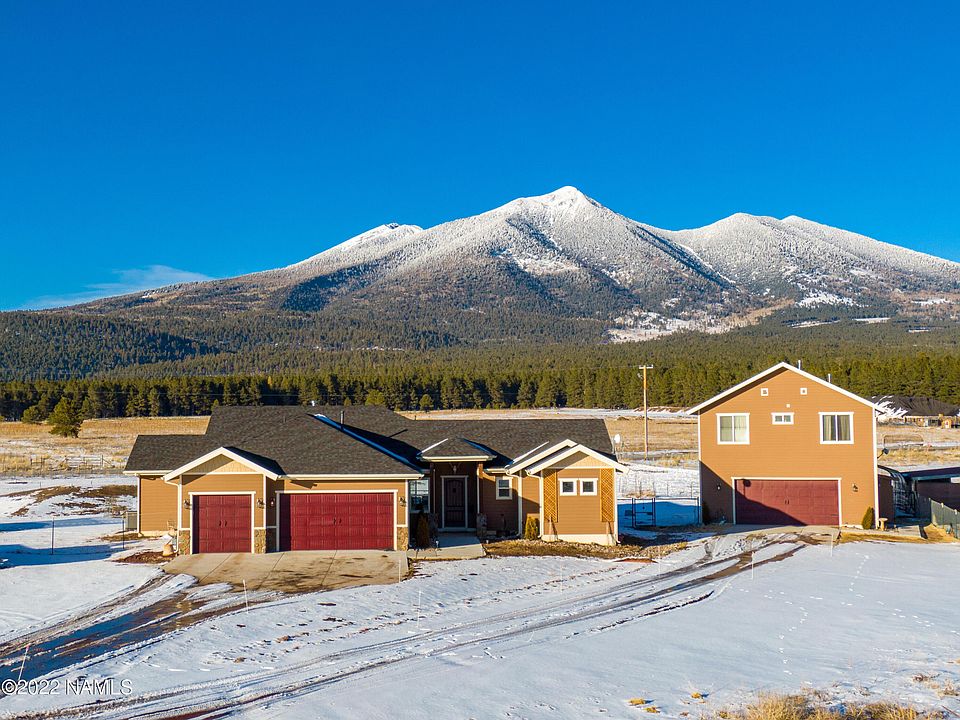 Come and see for yourself. Experience picture perfect views of Snow Bowl from nearly every room in the house! Be on the slopes minutes from your new home or enjoy biking, hiking, and horseback riding right out your door. This delightful ranch house sits upon 1.88 acres directly facing Mount Humphreys and has breath taking 360 degree views of Flagstaff's mountains, forest, and wide open skies. Please see the additional remarks and list of upgrades attached in the docs. There is definitely a great amount of pride of ownership that shows in this home. The 2,333 sq.ft. main house includes 4 bedrooms and 2.5 bathrooms and is welcoming with elegantly tall ceilings, plenty of natural light, and tasteful plank tile floor with mosaic accents throughout. A bonus is the entire main home is on a single level, with a level driveway and entry. You will be greeted by a spacious and inviting great room featuring a warming gas log fireplace and stone veneer, the perfect place to relax on a snowy day. The light and bright kitchen is a great open space for entertaining. Cook a favorite meal in the charming kitchen and host guests in the formal dining room/ front sitting room. Kitchen upgrades include the beautiful granite countertops, custom lighting, stainless steel appliances, wood deco wall, large pantry, a countertop bar and breakfast nook facing north peak views. The floorpan is split, with the primary bedroom privately located on the east wing and has a gas stove for a warm ambiance. The large primary bathroom has plenty of cabinet and counter space, dual sinks, a separate tub and shower, a towel warming bar, and a huge walk-in closet with windows and plenty of shelves. Two of the three additional bedrooms have walk-in closets. The laundry room is conveniently located between the garage and the kitchen and is complete with custom cabinets, granite countertops, a laundry sink, and a wall of custom shelves. The main house garage has two standard parking bays and a third extra deep bay. Enjoy countless sunrises and sunsets relaxing on the back deck or enjoying the new hot tub. The separate carriage house is private, complete with a dedicated paved driveway, two care garage on the main level with laundry hook-up and a 900 sq.ft. guest quarters above. The 2 bedroom/ 1 bath guest house has direct, unblocked views of the peaks from the living room, kitchen, and balcony that face north. The kitchen is complete with full sized stainless steel appliances, including a gas range. Both bedrooms have south mountain views and share a full bathroom. With No HOA and plenty of space, you are welcome to park your trailer, RV, boat, and other toys! The property has a perimeter fence around most of the acreage and set-up for horses and farm animals with separated grazing areas, a run-in stall shelter on a concrete slab, tack shed, saddle nook in the garage, covered shelter, electric fence, trailer accessible gates, and more! * See the list of additional upgrades attached in the documents.