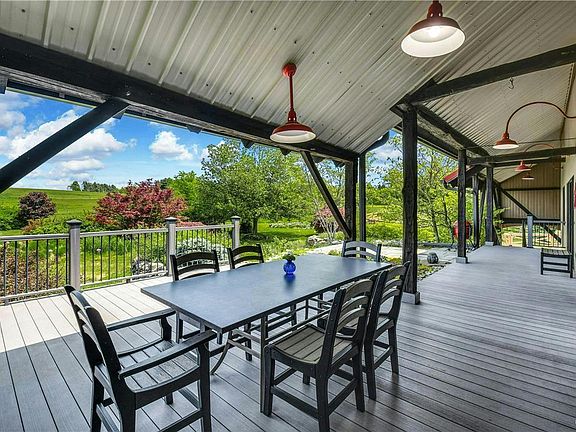 Entry to the home begins with bluestone steps leading to an expansive deck with long-range views. Glass doors lead to the great room, large enough to accommodate both living and dining spaces. The eat-in kitchen boasts locally sourced slate countertops, stainless appliances and plenty of prep and storage space. The first-floor primary suite includes a separate dressing room. Upstairs, two additional suites as well as office space offer bucolic views. The attached 2-car garage with parking pad and adjacent exerciser room, as well as a detached 1-car garage with loft storage, ensure plenty of space for guests as well as hobbies.