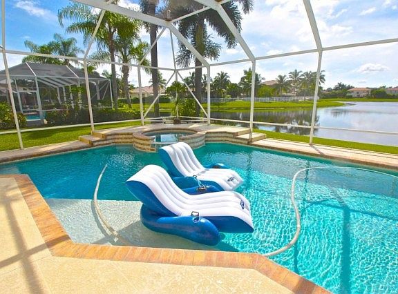 Spectacular Santa Fe model with 4 BR/3 BA PLUS LOFT, grand foyer, vaulted ceilings, 3 car garage, situated on a premium lake front lot w/ screen enclosed heated pool w/spa. Chef's kitchen, Kitchen Aid stainless appliances, desk area, corian counters, walk-in pantry, large island w/ snack bar, bay window dining area overlooking pool/lake.Master retreat boasts a balcony also overlooking pool/lake, master bath w/ sep. garden tub & walk-in shower. Features include high hat lighting, newer washer/dryer, 2 newer Lennox A/C units, new sprinkler/pool pumps, lake fed irrigation sys., hurricane shutters, impact garage doors. Enjoy amenities such as 24 hr. guard gate, club house, fitness ctr, billiards, media room, pool, playground, tennis & basketball crts. A rated schools.Shows like a model!