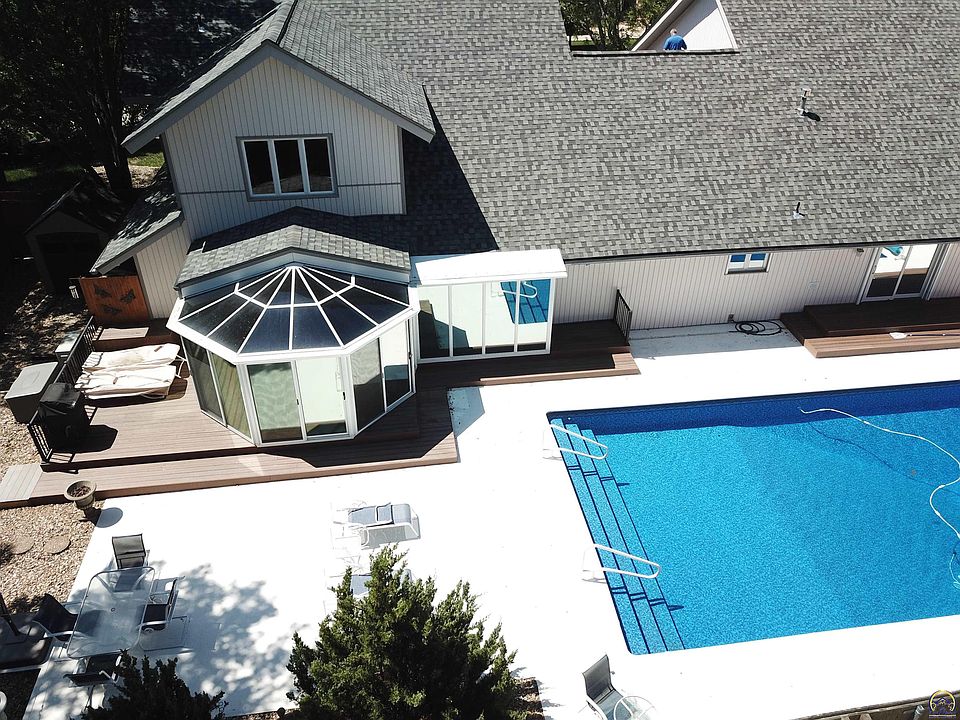 Sherwood Estates, lake view, 1-1/2 story home with unique, Mid-Century charm in Washburn Rural school district on a corner lot. This home boasts, 4 bedrooms ,3-1/2 baths, 4200+ square feet, 3 car garage plus additional parking in front and on west side of the home. Inground 40' x 18' saltwater pool with steps and privacy fence; 4 seasons room with Daikin mini-split heat/air unit to keep you comfortable year-round. Spacious primary bedroom on main level with jacuzzi tub and shower in ensuite bathroom. Main floor laundry. Updated 2nd Shower, and Roll Shutters on the main floor. Wet bar entertaining area and remodeled formal dining room off the kitchen. and a whole home backup generator with surge protector to boot.