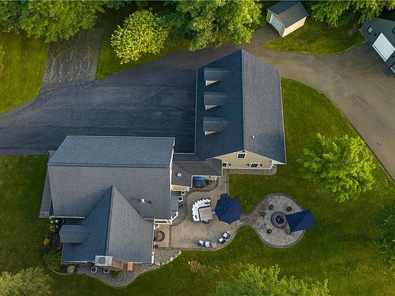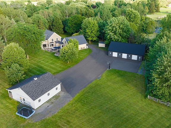Exquisite custom built home with four bedrooms, five full and two half baths on 5 acres offering the finest materials and craftsmanship. The home has an eat-in chef's kitchen, enormous island with microwave drawer, second dishwasher, double ovens, Wolf six burner stove, gorgeous granite, beverage station with cooler, large built-in Thermador wine refrigerator. Oversized gas fireplace, walk in pantry, half bath, sliders that lead to an oversized stamped concrete patio with built-in fire pit. Second level offers the Primary suite with vaulted ceilings, walk-in custom closet with heated floor, primary bath with walk-in shower, water closet, double sink and heated floors, two additional bedrooms with their own en-suite baths and custom closets, and laundry room. Fourth bedroom/office/gym over the garage has an en-suite bath. Partially finished basement with half bath and laundry and attached three car garage. Two out-buildings one a horse barn and the other is a steel garage fully finished in the past year with full bathroom and tiled shower, entertaining area, commercial built-in walk in cooler, second level with tons of storage, building is heated and cooled with four parking bays.