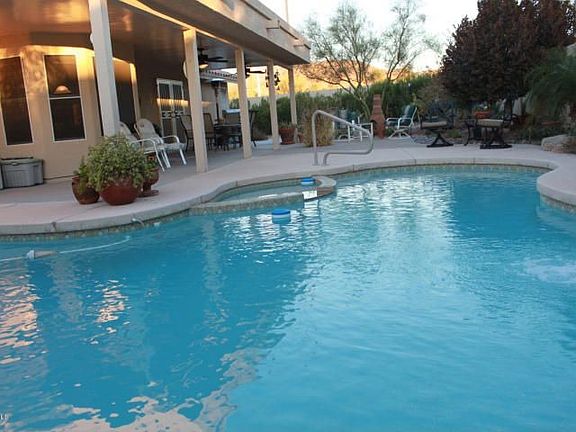 Very private quiet location abutting The mountains of the east valley. Well maintained home with large backyard and relaxing heated swimming pool. Three car garage perfect for the sports car or weekend project. Updated kitchen with stainless steel appliances, breakfast nook & formal dining area. Kitchen is open to the family room and opens out onto the covered patio for poolside entertaining. Large master suite, walk-in closet, dual vanities, seperate tub and shower with private access to rear yard. Home is equipped with security system, ceiling fans and can be purchased partially furnished. Very clean and move-in ready, just bring your suitcases!(Source: zBestListings.com(11) for VisualShows.com)