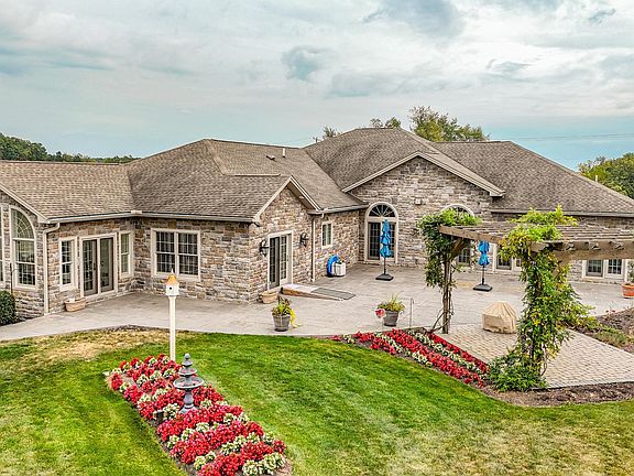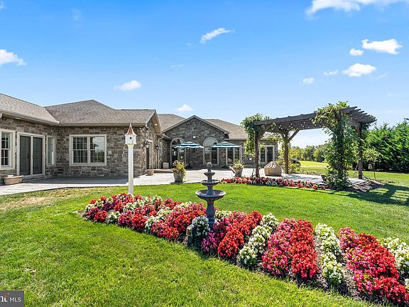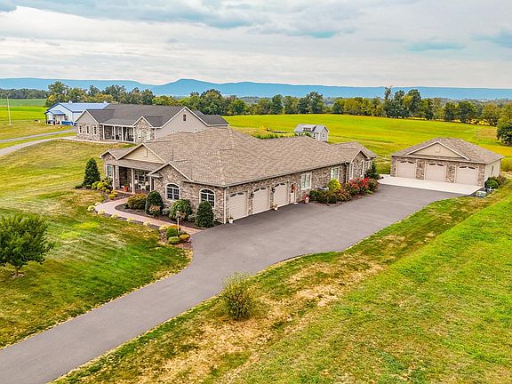 LUXURY LIVING IN GREENCASTLE! Welcome to this custom-designed all stone rancher, perfectly situated on nearly 2 acres. Set in a beautiful rural location, this home offers stunning pastoral and mountain views in every direction. With over 3,800 finished square feet, this 3-4 bedroom, 4.5 bath rancher blends elegance, comfort and craftsmanship throughout. Step inside to a gracious foyer that opens into a massive Great Room with cathedral ceiling, gas fireplace and flanked by a formal dining room with tray ceiling and a private professional office. The gourmet kitchen is a true centerpiece, featuring custom cherry cabinetry, stainless steel appliances, and an oversized granite island (6' x 5.5') with prep sink and under-counter refrigerator/freezer. A six-burner gas range, refrigerator, built-in double ovens and microwave make this kitchen a chef's dream come true. The kitchen flows seamlessly into the casual dining area and family room where you'll find a floor to ceiling stone fireplace and soaring beamed cathedral ceiling. Enjoy year-round beauty from the four-season sunroom, designed with heated ceramic tile floor and a full wall of Palladian windows framing panoramic views. The luxurious Primary Suite includes a tray ceiling, cozy gas fireplace, walk-in closet with custom organizers, and a spa-like primary bathroom with heated ceramic floors, double vanities, a custom-tiled walk-in-shower and a Whirlpool free standing jetted tub. Two additional bedrooms share a Jack-and-Jill bathroom with ceramic tile flooring, a walk-in jetted tub, and a separate steam shower. Additional spaces include a large walk-in pantry with barn door access and a large fully equipped laundry room with abundant cabinetry, granite counters and ceramic tile flooring. The laundry opens directly to the attached 3-car garage featuring 12-foot ceiling, epoxy flooring, and a convenient third full bathroom. BUT THERE'S MORE! A bonus detached 3-car garage with 12-foot ceiling offers heating, air conditioning, epoxy flooring and a fourth full bathroom, ideal for car enthusiasts, hobbyists, or extra storage. Other notable features include hardwood flooring and recessed lighting throughout, 3 gas fireplaces, filled with natural light by Andersen windows, French doors with battery-operated blinds, a 30' x 8'stamped concrete covered front porch and a 47' x 39' stamped concrete patio with an attached paver pergola complete with lights, a gas firepit, and a stunning, well established wisteria over the pergola creating a truly picturesque outdoor retreat and entertainment area, both hot and cold water exterior faucets, motion lighting in garages automatically turns on and off upon entering and exiting. The 103' x 74' unfinished basement with sealed concrete flooring is a blank slate for future expansion. This stunning home is truly one-of-a-kind in the Greencastle area. NO HOA, convenient location.
