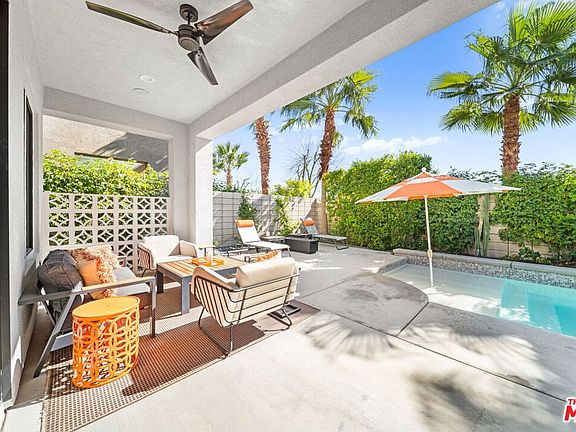 Welcome to the 67655 Chelsea Road inside the District East and one of the largest lots in the community featuring the Tribeca floor plan. Included with this former model unit are three bedrooms and three bathroom and nearly 2,100 sq. ft. of living space, in-ground pool and spa, owned solar, fireplace, and a large 2 car garage with ample storage. There are four distinct outdoor living spaces which include an outdoor fire feature, fountain, dining areas and offer spectacular mountain views. This move-in ready home features an open concept living space, distinct dining area, breakfast bar, quartz countertops, stainless steel appliances, ceramic tile flooring on the primary level and upstairs in the bathrooms and laundry room; all bedrooms are carpeted. There is a large bedroom and shared bathroom with shower on the ground floor, and two bedrooms with private bathrooms upstairs. The living room is highlighted by telescoping doors which open to the pool and offer the new owner that indoor/outdoor living ideal. The home is an end unit home and is also located within a pedestrian friendly distance of many shops, restaurants and grocery stores. In addition, the community includes a dog park, fitness & community center, pool and spa. This is a truly unique home inside District East and we look forward to seeing you!