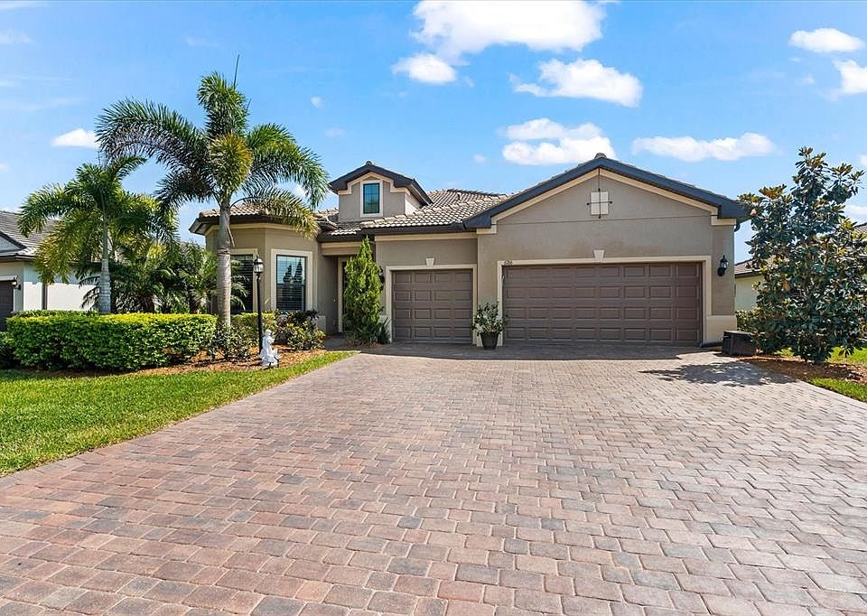 HUGE PRICE IMPROVEMENT ! Don’t let this exceptional opportunity slip away! Own the executive-style Stonewater Model in Del Webb, situated on a large lot with coveted north/south exposure and a mesmerizing view, offering the ultimate setting for luxurious Florida living. With its thoughtfully designed floorplan and stunning curb appeal, this home is truly a rare find. Upon entering through the striking double front doors, you’ll be greeted by a mix of beautifully appointed ceramic tile floors, hardwoods, and carpet that exude style and sophistication. This home boasts a plethora of upgrades starting with the chef-inspired kitchen featuring the upgraded KitchenAid package, including ample cabinets, soft-close drawers, pull-out drawers, a gas cooktop with a wood hood vent and built-in oven and microwave. The kitchen’s stately appearance is complemented by neutral light quartz countertops and glass backsplash, contrasting cabinets, and a spacious island perfect for entertaining guests. Accent walls add to the home’s charming décor, while the oversized great room showcases stunning coffered ceilings. Crown molding in the main living area adds an elegant touch, while the den, with its double glass door entry and hardwood floors, offers versatility for various uses. The foyer welcomes you with its light and bright ambiance, evoking a warm “welcome home” feeling. Your guests will enjoy their private bath with a floor-to-ceiling tiled shower, providing comfort and convenience. The owner’s retreat is generously sized and features a dropped tray ceiling with double doors leading to the ensuite with an oversized walk-in shower, dual sinks, and tasteful finishes. The highlight is the expansive walk-in closet, a dream for most homeowners. Everything in this home is designed for comfort and functionality, including the dreamy laundry room with plenty of cabinets and a sink. Step outside to the large lanai with its stunning water view and breathtaking colorful Florida skies, creating the perfect backdrop for outdoor relaxation and entertainment. The owner’s added a whole-home generator and remote-controlled Kevlar hurricane screens for safety and protection from the weather. Spanning 2,852 square feet with soaring 12-foot ceilings, this home offers 3 bedrooms, 3 bathrooms, a den, and a spacious 3-car garage. The open layout fosters a seamless flow between the living spaces, making it ideal for both entertaining and everyday living.