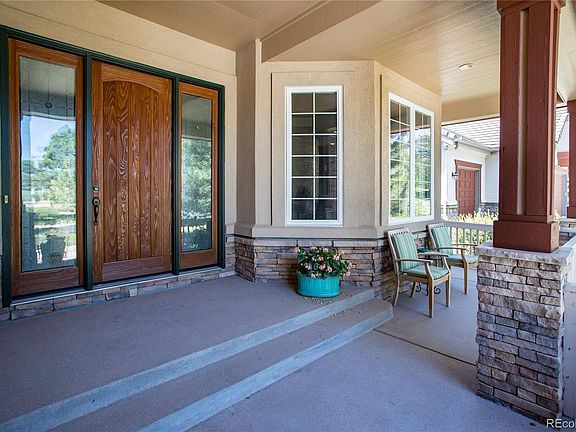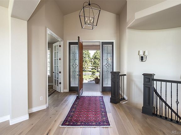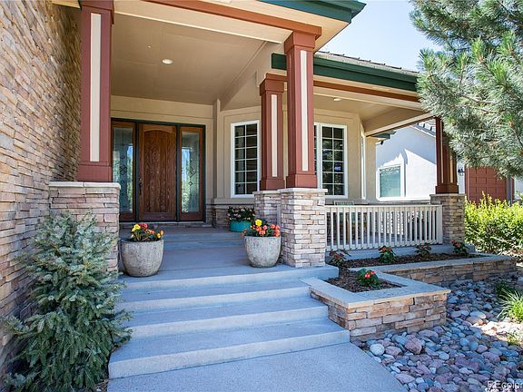 This beautifully remodeled ranch style patio home is located in the gated community of Daniel's Ridge in Castle Pines North. It offers stunning views of the 8th fairway of The Ridge Golf Course with Pikes Peak in the backdrop. The house has been meticulously maintained and underwent significant upgrades in recent years. The front yard has been completely transformed with new plantings, a walkway, a raised stone wall garden and upgraded covered front porch. The porch now features "comfort height" stairs for easier access and the driveway, walkway and front porch are heated, ensuring snow removal is hassle-free. Upon entering the property, you will be greeted by a grand and welcoming open floor plan with high ceilings, plenty of natural light, and beautiful wide plank wood floors that extend throughout the main level of the home. The family room boasts vaulted ceilings, a stacked stone fireplace, and a wall of windows offering expansive golf course views. The kitchen has undergone a complete remodel, featuring quartz countertops, stainless steel appliances, a Sub Zero refrigerator, Viking gas stove and double ovens, a center island and a pantry. Adjacent to the kitchen, there is a dining room with a custom built-in buffet and an adjoining Butler's pantry equipped with attractive glass cabinets, a wine fridge and an ice maker. A Handsome study with coffered ceiling and custom built bookcase adds to the elegance of the home. The main floor primary suite is very spacious and provides views of the golf course. It includes a luxurious bath with and enormous walk-in closet. The powder room and main floor laundry room have also been recently remodeled, with the laundry room offering plenty of cabinet, drawer and countertop space. Additional features of the home include a finished garden level basement with wet bar, oversized, heated 3-car garage with epoxy floors, a spacious Trex deck with a retractable awning and a concrete tile roof.