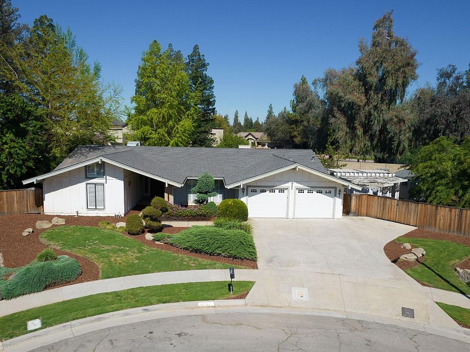 This one owner Northwest Fresno custom built home is at the very end of a beautifully kept cul-de-sac street on one of the largest lots (17,500 sq. ft.) in Garden View West Estates. Inside the double door entry is a unique glass atrium with inviting views of nicely landscaped backyard. Spacious LR & formal DR features gorgeous high vaulted wood beam celling, front window plantation shutters & rear french doors to backyard patio. Nicely updated Kitchen features beautiful custom cabinetry with special pull-outs, granite counters with tiled backsplash & matching tiled floors, Miele 5-burner gas cook-top, Bosch double ovens, GE Profile refrigerator, breakfast bar, built-in desk & large walk-in pantry. Eating area offers bay window views of side yard. Comfortable FR offers vaulted beam ceiling with spot lights & ceiling fan, gas insert fireplace with custom mantle & built-in bookcase. Also updated is the large utility room and half bath with outdoor access. The separate BR wing has a spacious MBR suite with backyard views and patio access and is all ready for the next Buyer's updates. The oversized backyard offers 3 separate large yard areas with mature landscape, large covered patio, brick pathways, fenced garden area, large Tuff Storage Shed, small orchard & RV parking area. Home is conveniently located near new shopping centers, restaurants, golf & the popular Marketplace at El Paseo. After 45 years of original ownership, it's now your turn to make this special home yours!