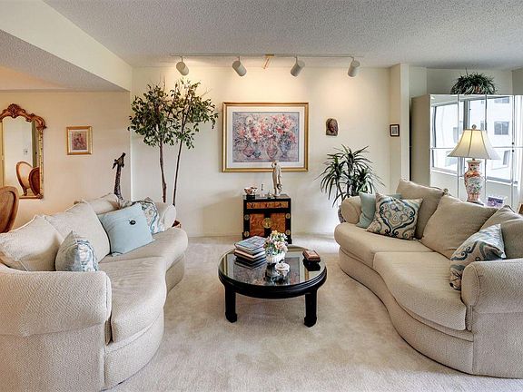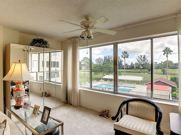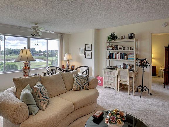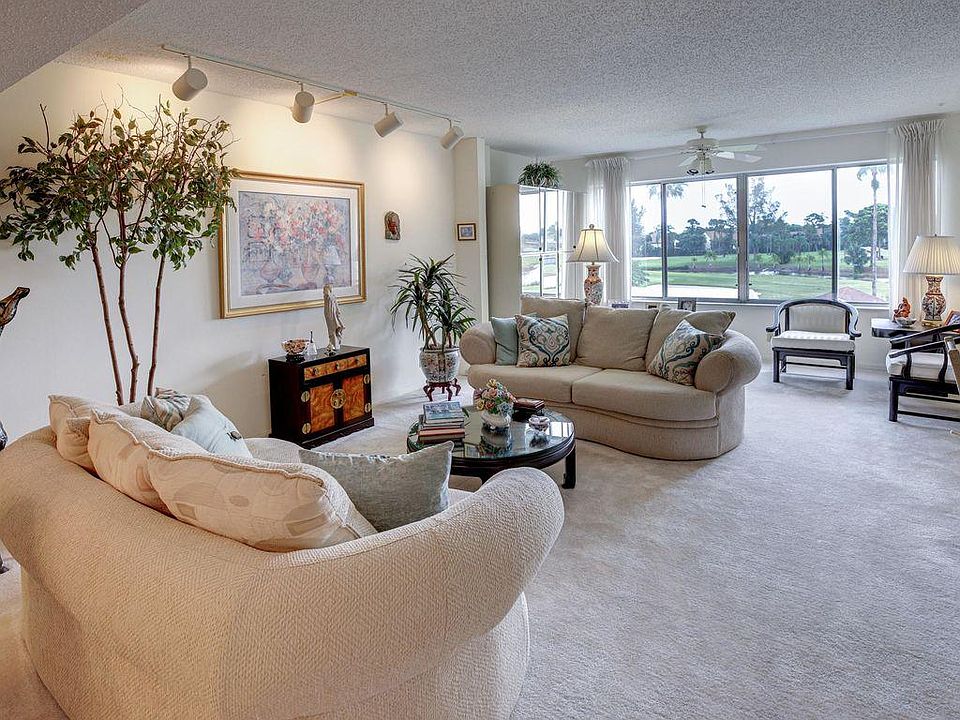 This Amazing 1400 sf condo has an extended living room with fabulous views of a lake, community pool, golf course and sunrises. It has 2 bedrooms, 2 baths, newer plush white carpet throughout the dining, living and bedrooms. You will enjoy a large eat-in-kitchen with crown molding and refaced cabinets with pull out drawers. Master is spacious w/ gorgeous views and a large walk in closet. The master spa like bathroom is beautiful with dual sinks, newer vanity and walk in shower. Guest bedroom has updated hall bath. Newer AC unit. Poinciana CC is located close the beach, PBI, shopping, major highways. Enjoy the clubhouse with Mel's cafe restaurant that is open for breakfast, lunch and dinner. Amenities include golf, tennis, gym, events, social clubs, billards & more.