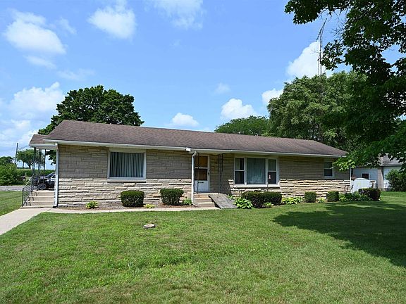 A one-story limestone home with a full basement situated on a double corner lot, featuring 3-4 bedrooms and 1.5 bathrooms. The spacious living area boasts hardwood floors and a picture window, while a wood-burning fireplace graces the dining room. Each bedroom offers ample closet space. The additional living space could be transformed into an office for a home business, a primary bedroom suite, or a perfect room for your hobbies. With a 1.5-car attached garage, storage sheds, and a full basement, there is plenty of storage available.  Enjoy small town living and a bit of country at the same time!