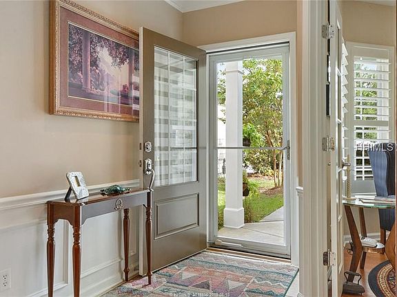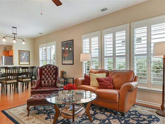 Must see Pine Spring model with walk-up stairs in the extended garage. This beautiful, 3 bdrms, 2 baths home with wood floors in the great room, carpet in the bedrooms and tile in the baths The kitchen has SS appliances, corian counters and a large pantry. Right off the kitchen is a Carolina room, which leads to a three-season lanai with a wooded view. Hurricane shutters, tankless water heat, utility sink in the garage. This property is located on the north side of Sun City Hilton Head in a wonderful community close to Town Square amenities.