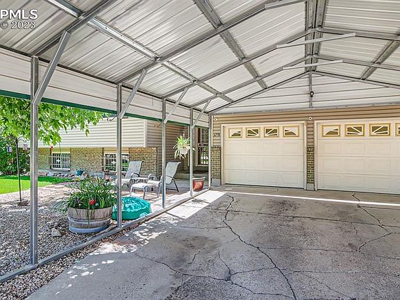 Corner Cul de sac charmer on a huge fully beautifully landscaped lot with central air conditioning. Interior of home newly painted throughout most rooms. 5 bedrooms, 3 bathrooms, 2 car attached garage, 2 car covered carport on large driveway with room for additional parking. Foyer entrance has ceramic tile flooring, wood balusters and handrails, coat closet, garage access/owner entry, walkout to covered patio breezeway and backyard. Upper level boasts solid wood floors throughout, lots of natural light. Kitchen features ceramic tile flooring, upgraded appliances, gas line for 5 burner gas stove, wood cabinets, backsplash, decorative recessed wood trim ceiling light fixture, matching custom wood fur baby pet gates encloses kitchen area for safety. 3 bedrooms on upper level, full bath in hallway with skylight, primary bedroom has an adjoining 3/4 bath plus walkout to incredible freshly painted wood deck including retractable awning - greet the day with a cup of coffee or tea surrounded by an abundance of mature shade trees, staircase conveniently leads down to backyard. Lower level has family room with wood burning brickwork fireplace and moveable oak shelf, wood laminate flooring, 2 bedrooms have shelving in closets, 3/4 bath, extra large utility room. Fenced in backyard, covered patio/breezeway, tuff shed storage, large 'she' shed workshop equipped with electricity, auto sprinkler system, leaf gutters, garage remote controlled double doors, wall to wall storage cabinets and overhead shelves, upright freezer, wired security cameras ready for WiFi hookup, security front door/back door/primary room deck slider and lower level windows. Walking distance to elementary, middle and high school. Located within minutes to Fort Carson, fire station, emergency medical care facilities, shopping center, restaurants, parks, walking trails, Colorado Springs airport, Powers corridor, Marksheffel, I 25 and Hwy 85/87.