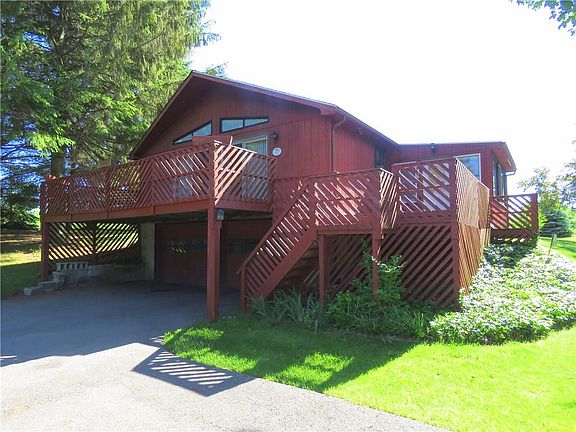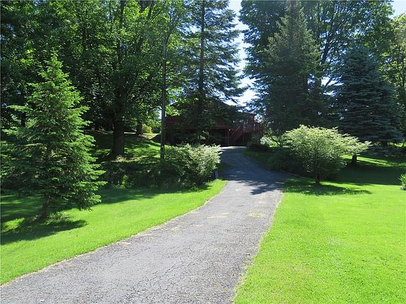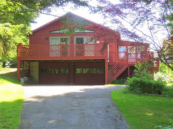 PRIVATE SETTING for this attractive CHALET-STYLE Ranch! OPEN FLOOR Plan! 3-Bedrm *Bath * Kitchen/Dining/Great Room with Cathedral Ceiling * Breakfast Bar *1st Floor Laundry *Built-in Wall A/c - Furnace plu Elec.Basebd Heat backup! *Public Water *FULL Walkout Basement with 2-Car Garage * Enclosed 3-Seasons Porch *NEW DUAL Sliders to Extensive Decking *Flowering Landscape *PRIVATE Backyard! LONG Paved Driveway with Turnaround!