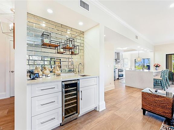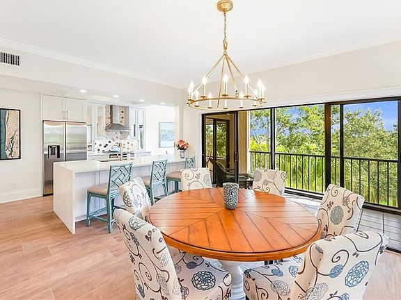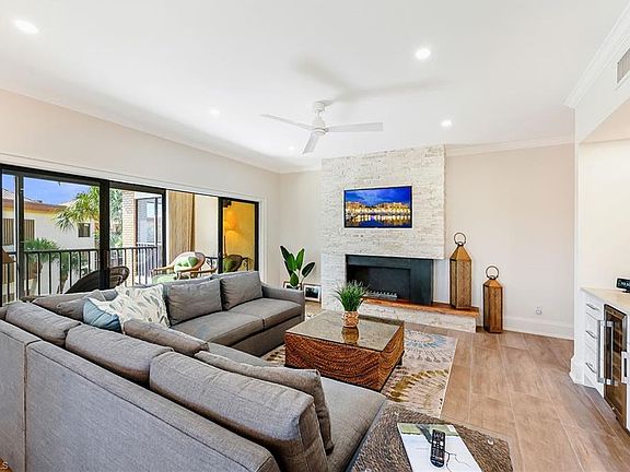 AVAILABLE SEASON 2026 or ANNUALLY. Nothing says "Naples" like Pelican Bay. BEAUTIFULLY remodeled with views from every room, this light, bright 3 bedroom/2 bath TOP FLOOR/ END UNIT in Interlachen showcases golf course views peeking through the treetops. With over 2,200 sf, the spacious living space offers comfortable sophistication with a faux fireplace, mounted Smart TV, wet bar and large dining table. The space is surrounded by a wraparound porch with multiple seating areas and sliding glass doors that open creating a screened balcony. The kitchen is well - equipped with both a breakfast bar and breakfast nook. The primary bedroom offers a king bed, walk-in closet, dual vanities and a walk-in shower. The second and third bedrooms offer a queen bed, and two twins, and the second bathroom serves both as an en-suite to the queen bedroom as well as a guest bath. There is also a desk/workspace area near nestled near the bedrooms as well as a full-size laundry. Interlachen is ideally located directly across from the tram station that will whisk you off to the members-only beach with food/beverage and chair service. Interlachen has its own heated pool and spa nestled island-style in a lagoon setting. In addition to the private beach club, Pelican Bay amenities include an active tennis and fitness center as well as a berm for walking/biking and a canoe/kayak launch. Conveniently located between shopping/dining options at Waterside Shops & Mercato in North Naples and only a 10 -15-minute drive to Old Naples.