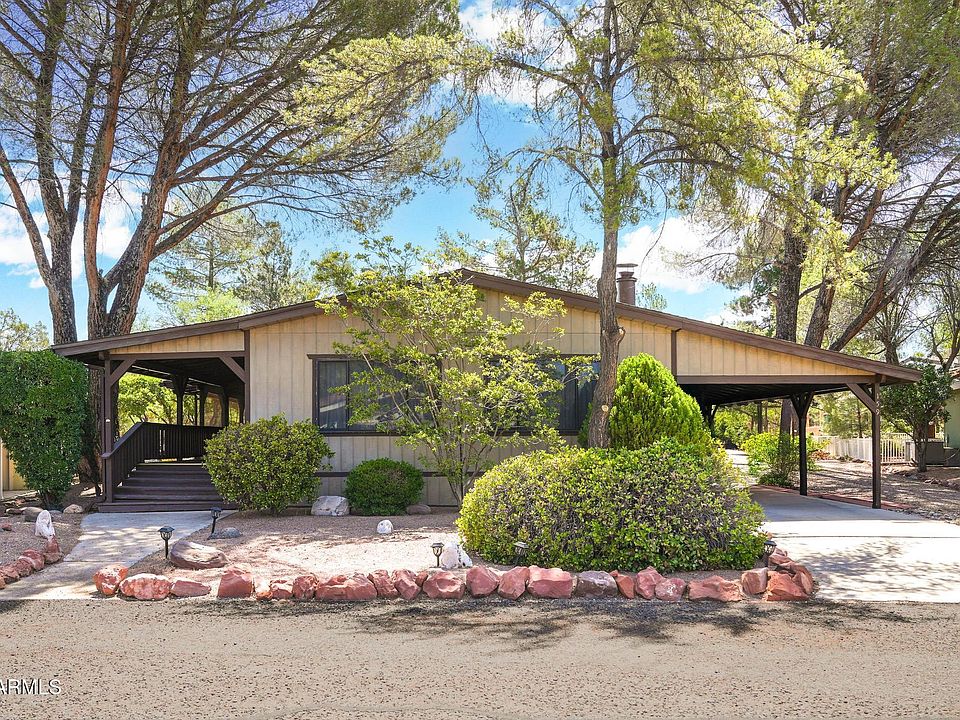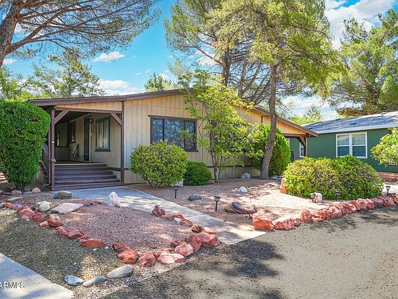 Oldie but goodie, screened in porch, lots of extra behind the home, common area belongs to Sedona Shadows but can be accessed behind the house currently. Lots of mature pine trees, nice wood burning rock fireplace, larger bedrooms, easy to live with floor plan,, living room and kitchen feel open, some built in desks and cabinets, plenty of outdoor living space. Furnishings can stay or go! No HOA, lot rent is required.