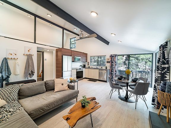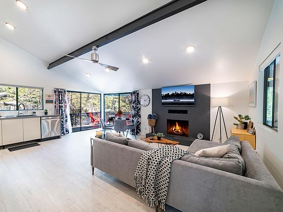 Welcome to our modern and fully luxury remodeled designer cabin in the Pines! This top of the line retreat boast high vaulted ceilings in the living area, lots of light and views through the brand new enlarged windows and glass doors, 2 corner sliding glass patio doors that open the whole back corner of cabin up to the large wrap around deck, 2 gas firepit areas, BBQ, 2 zip lines for kiddos to enjoy, as well as yard games (darts, ring toss, etc.).
