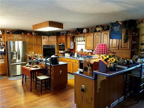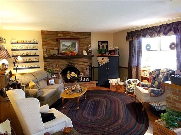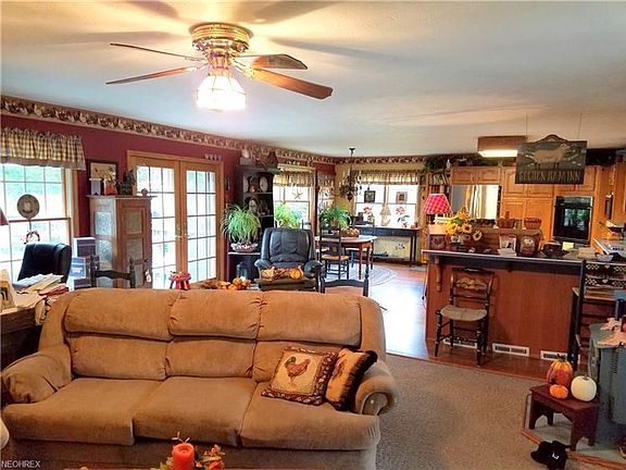 Country Ranch sets on 1.5 acres with 2448 square feet of living space and a very open floor plan. There are 4 bedrooms and 2 full baths. Formal living room with wood floor includes a very nice brick fireplace with raised hearth. It is open to the family room and the large kitchen which were added to the original home. The large country kitchen has quality Kraftmaid wood cabinets, center island, breakfast bar, wall oven, pantry cabinet and wood flooring. Dining area sets in front of a large bay window with built-in storage below. The addition has Andersen windows and a French door that leads to a large deck and paver patio. The additional private living space has a living room and another bedroom. Covered front porch is 8 ft by 20ft. There is a 20 ft by 30 ft basement with exterior access now used for a shop and storage. Addition has central heat and air while the original has hot water baseboard heat. Two sheds: 12 by 16 and 18 by 18.