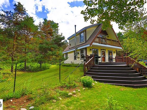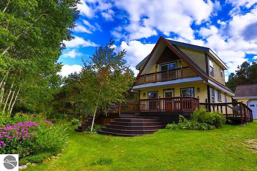 Live Your Northern Michigan Lifestyle in this charming chalet home on 10 acres with a 1.5 acre private, spring fed pond surrounded by mature pines. Custom woodwork throughout this unique home including natural log columns, cedar trim, maple wood floors and hickory cabinets. Large master suite with spa like master bath, walk in closet for her, separate over sized closet for him and deck overlooking the pond and nature. Large bedroom, full bath and laundry room on main floor. Enjoy dining or entertaining in this serene country setting on your 500 sf deck overlooking the pond and beautiful perennial flower gardens. This gorgeous property has rich, organic soil perfect for gardens with strawberry, blackberry, raspberry, blueberry bushes, peach and apple trees. Wood burning stove and newer energy efficient furnace keep utilities low. 8 x 10 outbuilding is a perfect "man cave" with 220 wiring and propane heat. There is another outbuilding being used as a wood shed. Garage is over sized with a work bench and lighting. Hunt on your own property full of deer and wildlife (Additional 10 acres adjacent to the property is available for sale. Please contact agent for information). Only 20 minutes from Traverse City or short drive to Cadillac, Crystal Mountain & Frankfort. Also near hundreds of miles of snowmobile trails and the Manistee River.