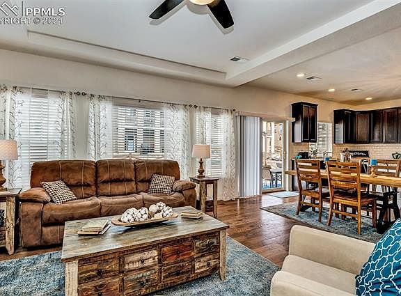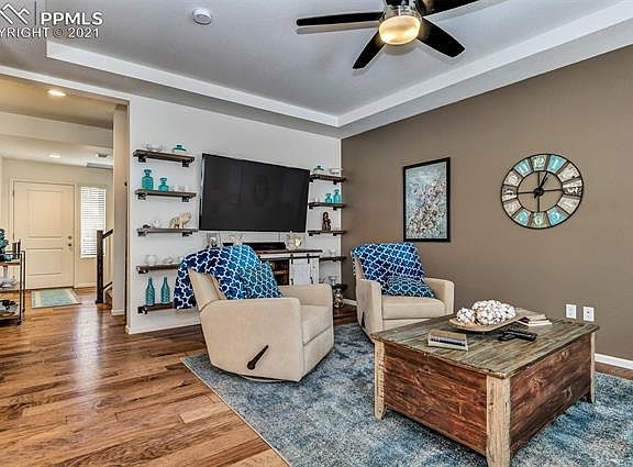 Enjoy open concept living filled with natural indoor light and a fantastic living space outdoors. Cozy up in your living room that is big enough for a large screen TV and a sectional. Enjoy creating a home cooked meal in your spacious kitchen which includes an amazing island, extra cupboard storage, and a large walk-in pantry. The great loft upstairs can be an office, a family room, or any other multi-use space you need. A nice-sized laundry room on the bedroom level is a convenient feature. Carefully chosen amenities include natural hardwood floor, black stainless steel appliances, white wood blinds throughout, and beveled subway tile in the kitchen. Other indoor amenities include a wood wall feature in the entryway, soft close cabinets and drawers in the kitchen, a trash can and recycling cabinet hidden away, cabinets in the island, upgraded granite in the kitchen, additional light above the island, ceiling fans in the living room and owners suite, upgraded carpet and pad, open rail on lower stairs, granite in upstairs bathrooms, large owners bath with rock floor and six inch rock strip on the wall in the shower, brushed nickel fixtures, A/C, storm door, and added windows on the garage door. Outside, enjoy a large 18 X 10 covered patio great for all season entertaining and a beautifully landscaped backyard. Amenities of the community include swimming pools, trails, an indoor gym, and easy access to the Powers corridor and I-25.