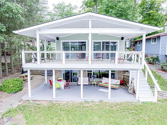 Stunning lakefront property on Sweetwater Lake featuring private dock and 2 bedroom with 2 full bathrooms! Home has been completely remodeled with wrap around covered rear porch with beautiful lake views, eat-in kitchen with center island and family room adjacent to the kitchen with a fireplace! Wake up to stunning views from the master suite with a full covered deck and walk-in closet! Enjoy two tiered deck just steps away from your own private access to the water! Also features a rare 3 car finished detached garage and car port! This turn key home is ready for all seasons!