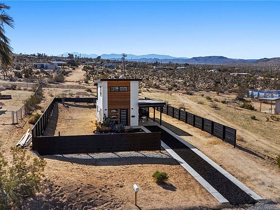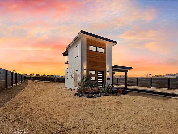 Casita Conejo, the Original Joshua Tree Tiny House build Airbnb by non-other than Robuilt is offered to you. Famously successful and a treasured icon of the industry and the source of so much influence. Upon approach you'll notice a Volcanic Cinder driveway that matches the general motif of the home. The interior of this tiny and function focused home features, multi function faucets, flexible, dining, living and sleeping spaces The first floor, enter a small but functional living room complete with places to sit, lounge and dine, a kitchen with full size electric stove and overhead microwave. Over head space dedicated to spices, and serve wear and under spaces for appliances and cook wear. Under the full size entry door and stairs is a large L shape closet hiding many home essentials for storage, linens, tech and all other goodies. The bathroom has a full size bathtub shower combo along with multi function faucet and a sleek design. The second floor Provides a light filled space with a walk-in closet similar to the Square footage of the whole first floor and access to the balcony. The balcony has an uninterrupted views across the Joshua Tree Village's arroyo with a covered sitting space. The exterior features the Patio and Pergola the fully fenced yard. On the Patio seats a perfect intimate setting for 4-6 with overhead lighting in the evening and a hot tub with just the perfect view of mountains and hills. The yard is adorned with large ocotillos and local boulders,