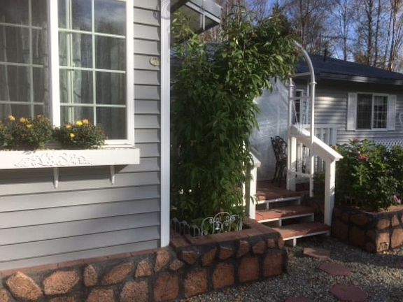 Property Id: 160189 Sweet, private, and peaceful mother-in-law apartment, in safe neighborhood on 2 acres, in park setting: *RN on site and PCA services available if needed *Fully furnished *All utilities and WiFi included *Private entrance (bracketed between fragrant roses and lilac blossoms) *Private patio *Private greenhouse *Private 900 sq ft courtyard w/raised beds for gardening *BBQ area with fire pit *Huge kid's play area *Large lawn *900 sq ft heated garage w/gym *250 sq ft heated kennel 19-year experienced RN on site to provide nursing support if needed. Apartment is approx 7 miles from downtown Wasilla restaurants, movie theater, shopping, and Wasilla Lake. Fishing, 4-wheeling trails, and a shooting range is within 5 miles, and skiing/snowboarding within 15 miles. Apartment has walk-in closet that doubles as small office space, and living room has pocket doors for privacy, with pull-out couch that transforms into 2nd bedroom for guests.