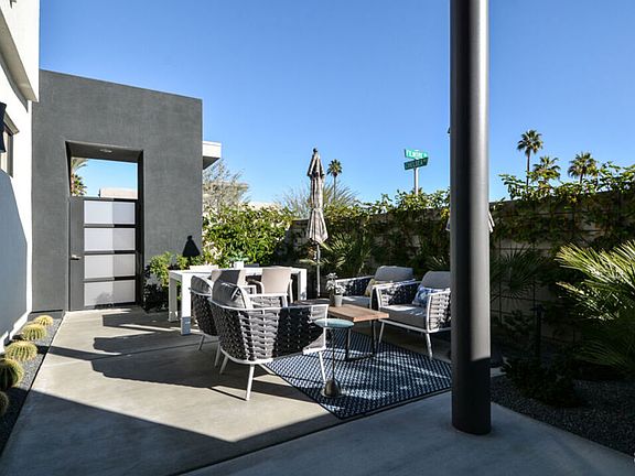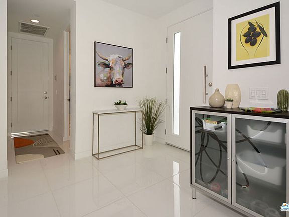 Award winning expanded Tribeca plan in District East located on the edge of Palm Springs in Cathedral City. Welcome to this highly upgraded 2020 home that feels like new with Porcelain Tile, Owned Solar, Surveillance system, Large Main Floor Bedroom, Triple-panel sliding patio doors that lead to a private Pool & Spa, Outdoor Shower, and Stunning South and West Mountain views. Seamless indoor-outdoor lifestyle on a corner lot with two private outdoor living areas and the professionally designed and installed aesthetically enhanced landscape lighting and plantings will make it hard to go indoors! Once inside enjoy the chef's kitchen with stainless appliances and quartz countertops on an oversize island open to the living and dining areas for the best in entrainment style living. Insulated garage with mini-split AC system and custom storage cabinets are all complimented by epoxy floors combined with suspended storage units for all your toys & equipment. Tastefully appointed upgrades throughout this home make it move in ready and all on 'Fee Land' that you own.