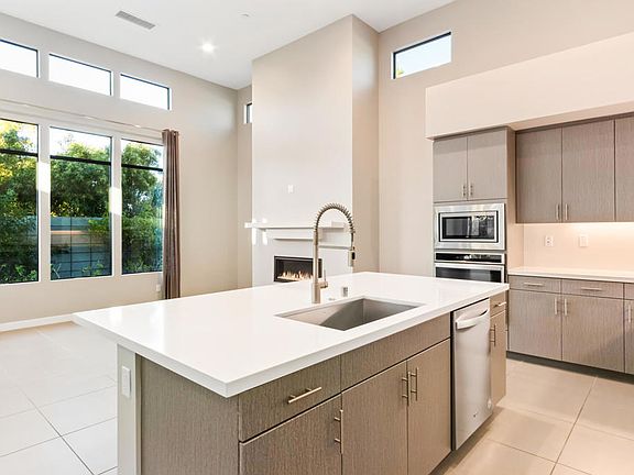 BACK ON THE MARKET!! This is a true special! Seller says; 'let's move it!' This is a SPECTACULAR, rare find! This home is three years old and has been upgraded to the MAX! (ALL ON ONE LEVEL) It has Solar, IN and PAID!, a split AC system was added to the garage, which has custom matching cabinets. During construction, the owner paid extra to convert the second bedroom to an attached, soundproof casita, WITH A PRIVATE ENTRANCE!) it has IT'S OWN split AC system, with a refrigerator and microwave! There is a BEAUTIFUL fountain off back patio and main bedroom. The sound of running water and the beautiful aesthetic it brings is a HUGE plus. This home backs up to an estate property, so there is nothing behind you but trees. It is A VERY PRIVATE SPACE with some SPECTACULAR MOUNTAIN VIEWS. The front courtyard patio is a very peaceful area, a place to relax and read a book, with beautiful mountain views to the South.Did I mention that YOU OWN the land? NO lease fee each month. Very low HOA's only $291.00 per month. This covers the gated entrance ,the pool and all of its amenities. NOW...regarding the inside, this home has SOARING raised ceilings which give it a feeling of tremendous openness with large picture windows throughout. Triple sliding glass doors lead to the patio. Mountain views abound. This has a great walking score, just behind Target, Trader Joes and Starbucks. This home has it all! Newly painted and carpeted, it shows like a model.