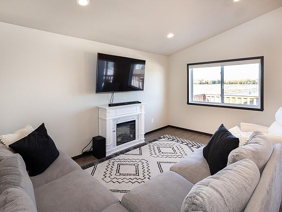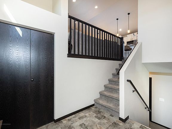 This modern home constructed in 2021, features numerous upgrades. It boasts an open-concept kitchen with vaulted ceilings, high-end appliances, a gas range, white cabinetry complemented by an additional pantry, quartz countertops, backsplash, and enhanced dimmable recessed lighting.