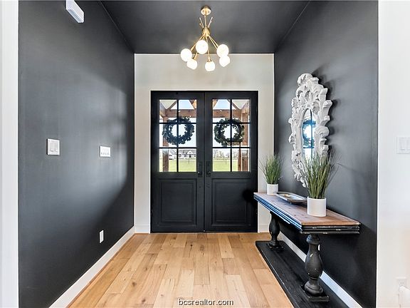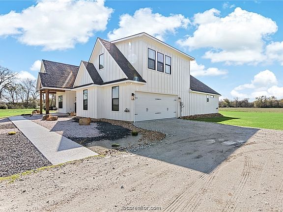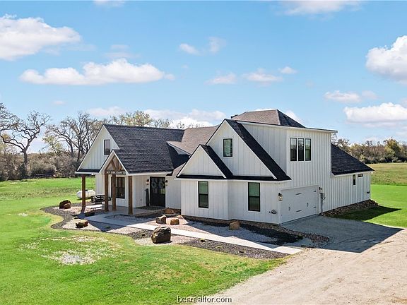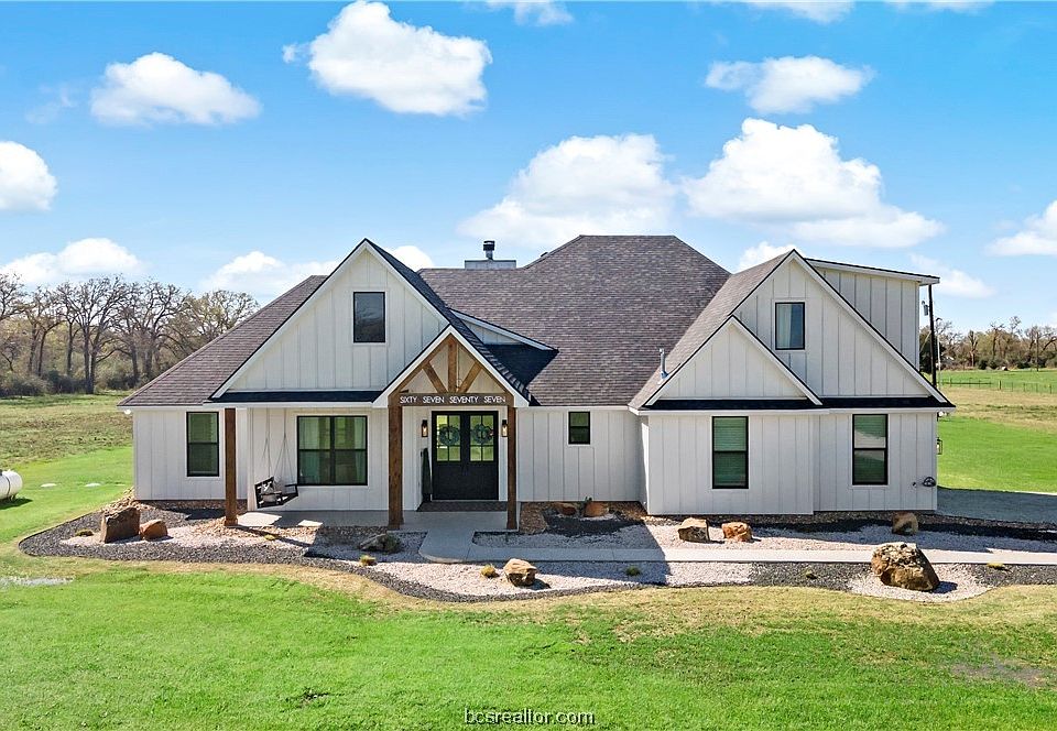 Tastefully designed, with modern and striking selections, situated on 15.72 acres with a sense of flowing space and dramatic flair, all encompassed into 2,997 sq. feet. Wide porches, an abundance of natural light and true beauty at every turn with a location that was too special to just build the ordinary. A soaring foyer will lead guests to a sophisticated, open concept living room with floor to ceiling painted brick fireplace, engineered white oak hardwood flooring and an unobstructed view to the beautiful back yard/pasture, accented by a set of Pinkys custom full glass, iron, double doors. Modern style comes home in this high tech, high functioning kitchen featuring Dolomite countertops, NXR 6 burner gas range, with griddle and two ovens, large center island with farmhouse apron sink and oversized walk in Butlers pantry. A central dining space, with dry bar and double wine/beverage coolers finishes off this captivating yet comfortable open floor plan. The Master suite, situated for privacy, with walk-in closet, double sinks, large make-up vanity with lighted mirror and easy access to laundry room with sink, extra counter space and built-in hall tree. 6777 FM 1372 also features a beautiful front office with the same Pinkys custom iron doors, three guest bedrooms, two additional full bathrooms and a half bath. Escape to either the epoxy flake coated front or back porch and enjoy picturesque views and high quality living. Enjoy rural living here in North Zulch!