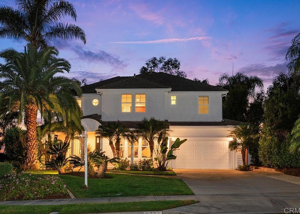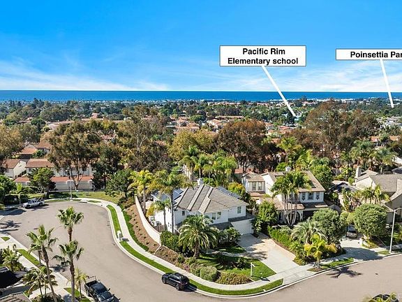 Ocean and Sunset/Sunrise Views from this stunning Standard Pacific, Bay Collection, Solar Paid Home. Resort-Style Living Experience with a Lushly landscaped Oasis entertainment design: Outdoor covered patio with recessed lighting, pre-wired for cable and speakers. Salt Water Pool/Spa (solar) and outdoor built in BBQ with enormous granite top outdoor island, includes beverage refrigerator. Custom built stand alone outdoor Fireplace (gas). Artificial grass in back yard. Cul-de-sac location. Main Floor downstairs has a bedroom/full bathroom ensuite and an extra large flex room which can be a bedroom/office/gym or ? Niche is ready for a closet if wanting a second bedroom downstairs. Upstairs has 3 bedrooms (one is Primary Bedroom, one is ensuite with full bathroom and a 3rd bedroom which has access to a hall way full bathroom. Additional loft with attached Office in the round could also be a bedroom. Upstairs has laundry room ready for side by side washer/dryer with built in sink. Primary Bedroom has huge cherry wood, custom organized walk in closet. Marble throughout primary bathroom with dual sinks and large roman tub and separate shower. Enjoy sunsets and sunrises off of Primary Bedroom View Deck. Large Gourmet kitchen with stainless steel appliances, 5 burner stove top, cherry wood cabinets and granite counter tops with back splash. Beautiful, newly refinished walnut wood floors extend to most of the downstairs main level. Double Oven, built in Microwave and refrigerator. Garage features extra storage cabinets. Property is on large .39 acre lot! Just .3 miles to Award winning Pacific Rim Elementary School and less than a mile to Poinsettia Park!
