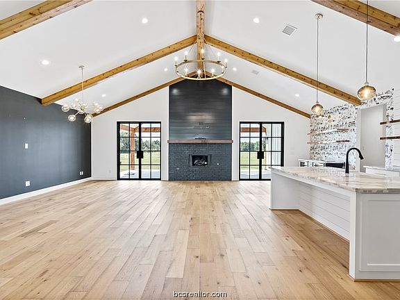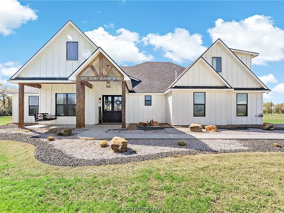 Tastefully designed, with modern and striking selections, situated on approximately 3 acres with a sense of flowing space and dramatic flair, all encompassed into 2,997 sq. feet. Wide porches, an abundance of natural light and true beauty at every turn with a location that was too special to just build the ordinary. A soaring foyer will lead guests to a sophisticated, open concept living room with floor to ceiling painted brick fireplace, engineered white oak hardwood flooring and an unobstructed view to the beautiful back yard/pasture, accented by a set of Pinkys custom full glass, iron, double doors. Modern style comes home in this high tech, high functioning kitchen featuring Dolomite countertops, NXR 6 burner gas range, with griddle and two ovens, large center island with farmhouse apron sink and oversized walk in Butlers pantry. A central dining space, with dry bar and double wine/beverage coolers finishes off this captivating yet comfortable open floor plan. The Master suite, situated for privacy, with walk-in closet, double sinks, large make-up vanity with lighted mirror and easy access to laundry room with sink, extra counter space and built-in hall tree. 6777 FM 1372 also features a beautiful front office with the same Pinkys custom iron doors, three guest bedrooms, two additional full bathrooms and a half bath. Escape to either the epoxy flake coated front or back porch and enjoy picturesque views and high-quality living. Enjoy rural living here in North Zulch!