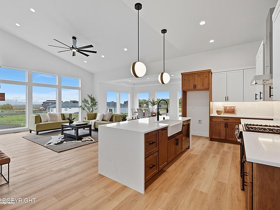 New Construction complete and can close in 30 days! Over $60,000 in upgrades: RV Parking Pad, Floating Shelves, Lighted MirrorsExtended Ceiling Heights, Quartz Waterfall IslandCast Iron Farm Sink, Metal Railing, HRVLava Stone Fireplace Surround, 3 sided mantelLarge Plank COREtec LVP, Large Format Tile, Mudroom Bench, Tile Entry, ect.''The Pinnacle'' Plan features a spacious entryway, a huge laundry room, two bedrooms, a full bathroom, and a large family room all downstairs. As you find your way upstairs you will be impressed by the open living room with a massive wall of south facing windows taking in the mountain views. The open kitchen includes custom cabinets, quartz counter tops, stainless steel appliances, tile backsplash, and a walk-in pantry with prep sink. Don't miss the generous dining room that could fit a table for 10 with direct access to the back BBQ balcony with views of the Talkeetna Range to the north. Also upstairs is a powder room, the home office, and the primary suite. Don't miss the primary ensuite bathroom, which comes with a soaking tub, custom tile walk-in shower with quartz bench, water closet, and dual vanity sink. If this home isn't exactly what you are looking for, we have several other lots and plans to choose from. Call today to make your new home vision come to life.