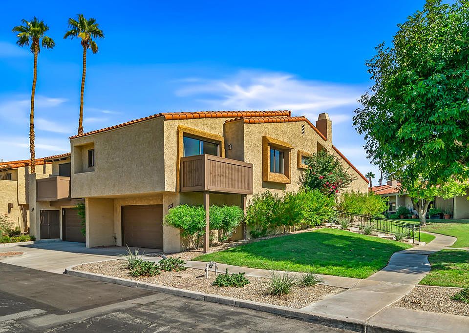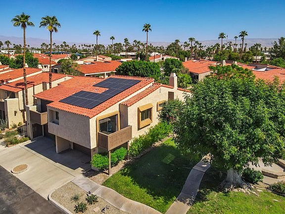 Nestled in the intimate and charming fee simple (you own the land) gated community of Sundial, centrally located near all conveniences of downtown Palm Springs (airport a block away, restaurants, city dog park, grocery shops, theatres...), sits this lovely end unit multi-level condo offering 2 bedrooms (spacious primary with large walk-in closet), 2 baths ( ensuite for primary) plus a flex room (could be used as an office, den or could easily be closed off and used as a 3rd bedroom) and an attached two car garage with plenty of storage space. The inviting and spacious (nearly 1400 sq.ft) open floor plan is filled with beautiful natural light in all rooms, vaulted ceilings & a large atrium. Enjoy the numerous cosmetic updates such as quartz slab countertops in kitchen & baths, timeless subway tile backsplash and shower, reglazed bathtub, laminate floors in main living area, modern floor tile in all baths, repainted throughout (no popcorn ceiling) & a towering, tiled fireplace in the main living space. Enjoy additional peace of mind and savings with a newer HVAC system, newer water heater, newer appliances including washer/dryer and a huge fully owned solar system (2021 with 28 panels) for maximum savings on electricity. Outdoors await an oversized covered patio with a view of one of the community pools as well as a balcony (redone in 2023) from the primary suite with spectacular mountain vistas. Looking for an easy move-in and even more value, this condo comes furnished as presented (partially furnished with many of the major pieces already there) including two large screen televisions. Sundial offers manicured grounds, a clubhouse, tennis/pickleball courts and 4 sparkling pools & spas ...this is one not to be missed!