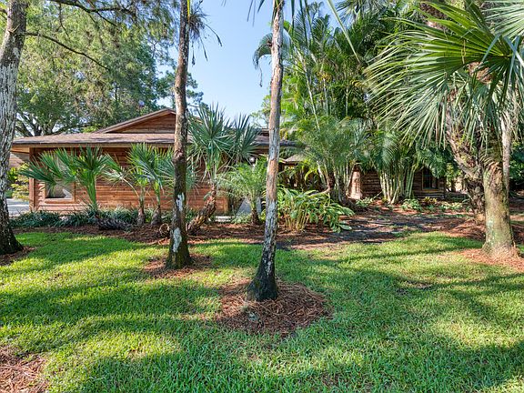 Enjoy everyday living at this private, idyllic retreat. This spacious 4/3/2 home is nestled on a wooded 1/2 acre lot on a quiet cul de sac street of only 8 homes. With nearly 2800 sq ft under AC, this home features a split floorplan, vaulted tongue & groove ceilings, a wood burning fireplace, an open kitchen with granite counter tops, wood cabinetry and SS appliances. The living room and dining room have hardwood floors. The large master suite has french doors which open to the large covered Lanai & pool. The backyard provides a tropical oasis setting, with travertine decking, salt system pool, spa, sandy beach area. There is a 200 sqft workshop/storage bldg. and plenty of land for your boats, trailers or other large equipment. This home is conveniently tucked away off Okeechobee Blvd,