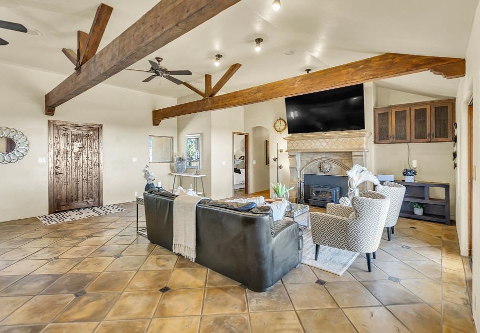 Car Collector's, Equestrian & Contractor's Dream! This single-story Spanish-style home offers 3 bedrooms, 2.5 baths, and an open floor plan with stunning beam ceilings. Perfectly situated on 10 sprawling acres, it provides endless space for toys, animals, and hobbies. Equestrian features include 5 stables and a tack room, while car enthusiasts will love the approx. 20,000 sq. ft. of covered, concrete-floored storage/workshop space with 40+ covered parking spots and an overhead lift. A seasonal creek adds natural beauty, and the electric gate entry provides privacy and curb appealideal for a home business. Estimated well yield 10 GPM. NID irrigation water available (buyer to verify). A rare opportunity combining comfort, function, and unlimited potential!