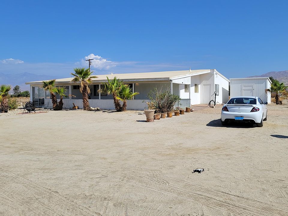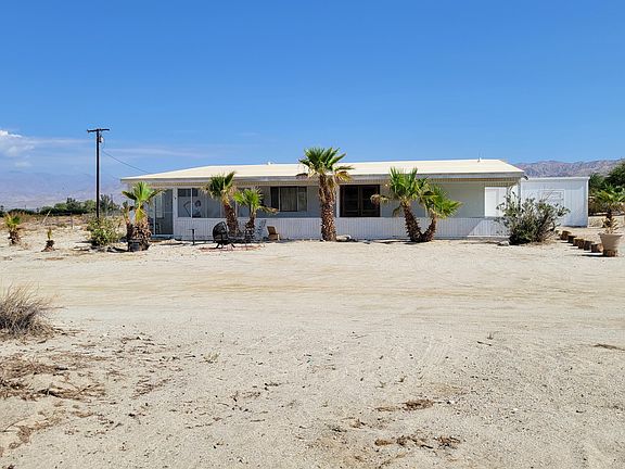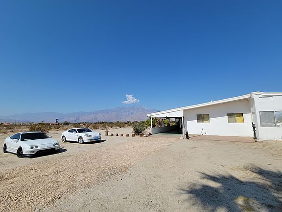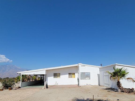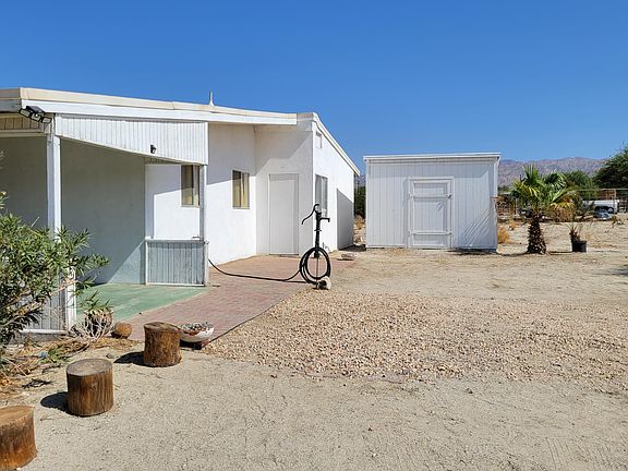 Oh the possibilities! Built in 1966, this 2 bedroom/1 bath, on 5 acres is waiting for you to turn this into your own personal desert oasis! A blank canvas that will unlock your imagination and excite the home improvement pro in you! Large, living room with beautiful solid pine beams, concrete slab flooring and large windows with a bar/counter between the kitchen and living room. The kitchen is a wonderful window into the past with the original Formica counters and solid birch cabinetry. 1 guestroom with large window and closet. Bathroom has tub/shower & dual sinks, with original Formica counters. The interior was reconfigured with walls added to make 2 additional rooms for a total of 4 rooms. Large front porch with an unobstructed view of the San Jacinto Mountains that can also be used as a carport. The property's water source is from well water (not metered) and it is also on septic. Concrete slab floors throughout (which can keep the home cooler) with 2 carpeted bedrooms. There is a wall AC unit and duct work is in place for central air/heat. Roof was redone in 2015 with a UV protected PVC material. Water heater replaced in 2017. The well tank was replaced in 2020. New breakers and electrical boxes in 2018. Property is unincorporated, subject to county rules/regulations. The white shed with skylight was permitted and is on the same security alarm system as the home through ADT. Home plans, zoning information and inventory list are attached to this listin