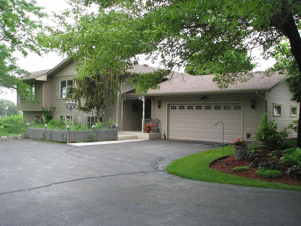 Well maintained rustic home situated on 4.76 acres with AG zoning. Home offers a touch of cottage style charm throughout. Second story deck offers privacy with a spectacular view of the countryside. Oak flooring throughout the upper level. Granite kitchen countertop. Family room has mahogany floor with Vermont Casting wood burning enamel parlor stove. There is a bonus room in lower level. Upper level sunroom offers a panoramic view & overlooks mature perennial gardens and landscaping. Finished lower level has a walkout to an outdoor room, patio and fountain. Newer 40 year roof, furnace & 14 seer AC unit, windows, & vinyl siding, and alarm system. Located on dead-end road offers solitude but only 10 min from By-pass 20 and 1 block south of 173. 36'x30' outbuilding with 6' porch facing the sunsets and volleyball court. Perfect to raise horses or run a business. 12' x 8' garden shed with loft. Heated attached 12' x 23' work shop behind garage. 3.5 acres of fenced pasture. R/O system.