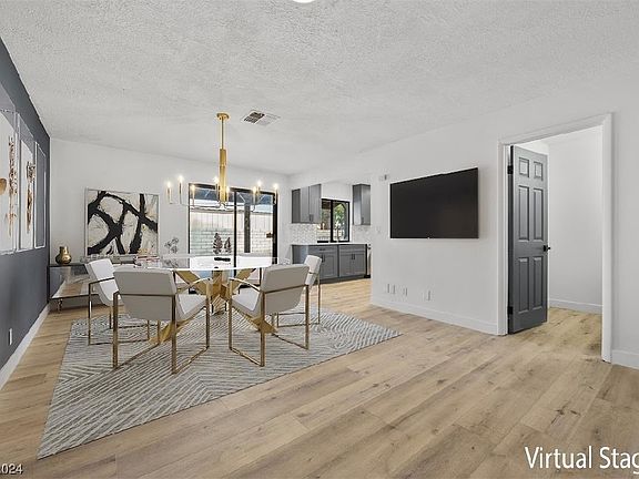 Welcome to your personal paradise! This charming single-story 4 bed/3 bath, set on fenced ¼ acre+ lot, with 3 car garage + RV parking, has it all. Fully renovated, move-in ready, with modern designer touches, throughout. The open floor plan is an entertainer’s dream: fully appointed chef’s kitchen with quartz counters, stainless steel appliances, and range hood, opens to great room with statement stone fireplace and large windows overlooking pool/spa + separate dining space with sliding door access to backyard. Backyard features mature landscaping, over-sized covered patio, pool/spa, and built-in bbq. Primary suite highlights a spa-like bathroom with 2 sinks, dual shower heads, and custom walk-in closet. Ideal location – convenient to the Strip, airport, shopping, and dining.