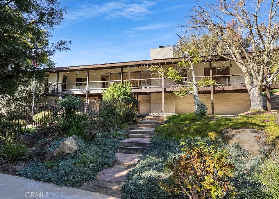 HAWARDEN HILLS- An exclusive Late Modernist 2 Level Ranch residence nestled within Hawarden Hills, one of the most desirable parts of Riverside. A deep feeling of serenity and beauty is achieved immediately as you transcend inside. Notice exquisite features such as hand-carved front doors, ornate Spanish chandeliers, a coalescence of hand-crafted wood, and precast concrete iron floating staircase. The grand cathedral ceilings, along with massive Picture Windows allow tranquil lighting to pour in from the panorama behind. In combination with the prominent fireplace of stone and updated flooring there is an impressive and peaceful ambiance. Beyond the dining room, and past the surrounding foliage filled sights, are Zen gardens, views of mountains, valleys and city marvels. You are led to the wraparound balcony that is ideal for birdwatching, your morning espresso or evening sips of libations. The spacious kitchen & family room is bursting with Asian inspired cabinetry and an extensive granite island. All 3 bedrooms on the West wing come with their own private balconies that bring resort-like vibrations with incredible views & gentle breezes. Located at the far East wing, the master suite exemplifies a stately feel with expansive closet lined chambers for your wardrobe and more sliding doors allow for personal access to the balcony. The layout of the home allows for separate living quarters should you desire this option. Non-basement apartment space within the home on the first level with its own entrance. Potential to have kitchenette in laundry room. In-law suite, or rental income. The bottom veranda overlooks the sanctuary garden and secluded pool & spa gathering area with access to the gorgeous granite hillside. Lemon, lime, nectarine and grapefruit trees are on property for your picking! Post & rail fencing that is light-lined travel up and down the private driveway--you may never want to leave the opulence that this home exudes. Newer floors, new interior/exterior paint, new air conditioner & furnace, new whole house fan & ceiling fans, new dishwasher, new microwave and RV parking are a few amenities to note. Should you desire, the size of the lot and layout of the home allow for possible future additions. Ease to 91 frwys & adorable local small business/organic produce shops are close by...Come take joy and immerse yourself in the vintage architecture and landscape designs that tie you together with nature in this ultimate California home!