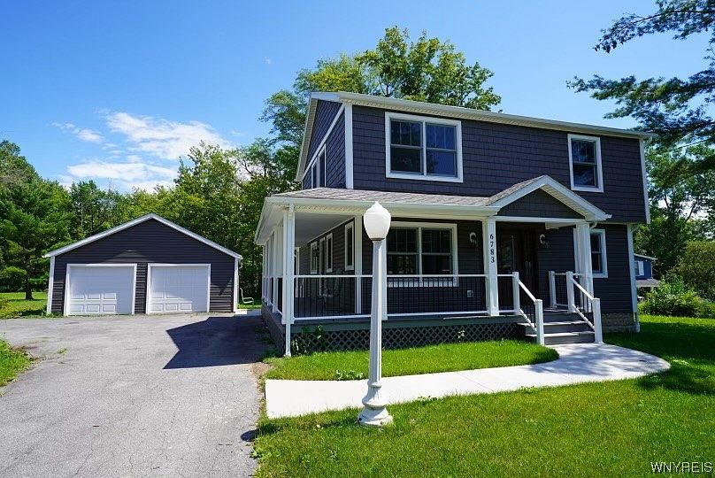 Beautifully updated like new home on an acre of land! Nothing has been left undone; Amazing open concept floor plan on the main floor; kitchen/dining/living room all flow together with vinyl flooring, the kitchen features kraft maid cabinets w/engineered solid surface countertops, 2 islands & beautiful light fixtures. (gas hook-up) Full bath on each floor with kraft maid cabinets with engineered solid surface countertops, ceramic tile; 1st floor has a walk-in shower and spot for 1st floor laundry and 2nd floor bath has a full deep tub. All 3 bedrooms offers spacious closets. The basement has a new egress window, can make the space into a bedroom, office, workshop, gym, etc.....The home features new windows, solid core doors, all new electrical, lighting, plumbing and fixtures. New furnace, central air and new roof on house and on the 2.5 car detached garage. New garage doors, new maintenance free vinyl siding and wrap around porch with composite decking. Acre lot, close to water with beautiful views, close to dining, shopping and recreation; easy access to downtown Buffalo and more! Stated lot size is per the attached survey. Come take a look at this brand new home!