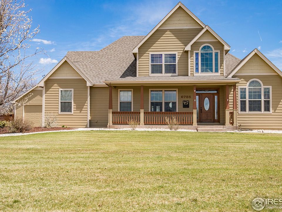 Pride of ownership shows throughout this immaculately cared for home.Country feel with just over 1 acre,conveniently located near I-25 and 34.Covered porches on front and rear,new trex deck in back.Stylish kitchen with custom granite,sink and faucet.Recently upgraded with 2 50 gallon recirculating water heaters and 96% Heil furnace and super quiet air conditioner. Custom basement with new 1080 projector and screen.Garage enthusiasts will love the 1000ft heated detached garage with attic storage.